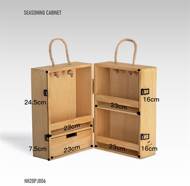 Hộp gỗ đựng đồ gia vị nấu ăn NatureHike NH20PJ006 được từ làm từ gỗ thông New Zealand, chắc chắn, bền đẹp, thời trang, chỉ nặng chưa tới 2kg. Hộp được thiết kế thông minh, dễ sử dụng, bảo vệ các món gia vị, phụ gia, chống trào đổ, ngăn ẩm mốc, bụi bẩn. Cho bữa ăn trong chuyến cắm trại, dã ngoại được chất lượng.