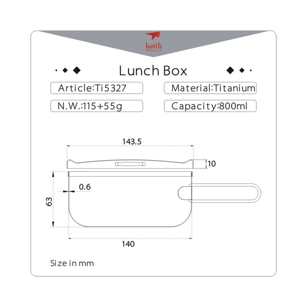 Hộp Lunch Box Titanium Keith Ti5327 800ml bằng titan nguyên chất có nắp, độ dày khoảng 0,6mm. Được làm bằng titan nguyên chất, an toàn và tốt cho sức khỏe, có khả năng chống axit và kiềm và chống ăn mòn. Không giữ lại bất kỳ hương vị nào sau thời gian dài sử dụng, đảm bảo sức khỏe cho mỗi bữa ăn. Lunch box phù hợp cho cuộc sống hàng ngày, bao gồm bữa sáng, bữa trưa và bữa tối, cũng như cho bữa trưa, cắm trại và các hoạt động ngoài trời của sinh viên và nhân viên văn phòng. Nó có thể được làm nóng trực tiếp bằng trên lửa, bếp từ và bếp điện để đun sôi nước và nấu ăn. Và cũng có thể được sử dụng để bảo quản thực phẩm.