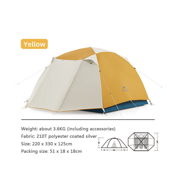 Lều 3 người: Kích thước sử dụng 220 x (55+180+55) x 125cm; Kích thước gấp gọn 52x16x16cm; Trọng lượng 3.1kg