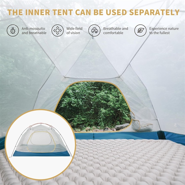 Đa chức năng: Thiết kế cửa đôi, lưới mật độ cao, chống muỗi và công trùng, thoáng khí, được trang bị cửa sổ thông gió để cải thiện lưu thông không khí, có thể sử dụng riêng cả lều bên trong và bên ngoài. Rèm cửa cũng có thể được sử dụng để chống nắng cùng với gậy leo núi, trụ chống tăng (có thể mua riêng). Nếu chỉ sử dụng lều bên trong, bạn có thể tận hưởng bầu trời đầy sao tuyệt đẹp khi nằm.