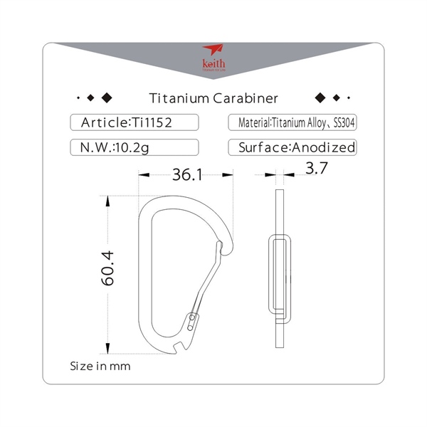 Móc khóa đa năng Keith Titanium Carabiner Ti1152 được làm bằng titan nguyên chất không có lớp lót và lớp phủ cao cấp. Nó không vị, không mùi và không độc hại. Ban đầu được thiết kế để đi bộ đường dài, cắm trại và du lịch. Titanium siêu nhẹ và siêu bền; nó thân thiện với môi trường, tương thích sinh học và ức chế vi khuẩn; nó cũng cực kỳ ít gây dị ứng và đặc biệt có khả năng chống ăn mòn.