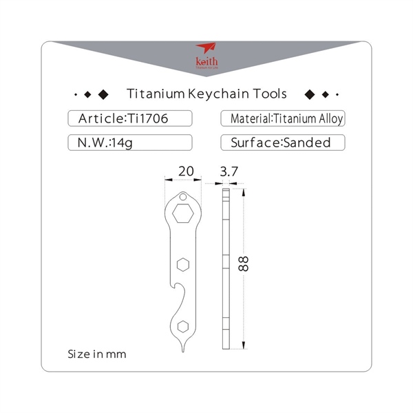 Móc khóa đa năng Keith Titanium Tool Ti1706 được làm bằng titan nguyên chất không có lớp lót và lớp phủ cao cấp. Nó không mùi và không độc hại. Ban đầu được thiết kế để đi bộ đường dài, cắm trại và du lịch, nó có thể hữu ích cho các buổi dã ngoại, chuẩn bị khẩn cấp, xung quanh nhà và tại văn phòng, có thể sử dụng như vít 10, 5.5, 4/1, dụng cụ mở nắp chai và tuốc nơ vít. Titanium siêu nhẹ và siêu bền; nó thân thiện với môi trường, tương thích sinh học và ức chế vi khuẩn; nó cũng cực kỳ ít gây dị ứng và đặc biệt có khả năng chống ăn mòn.