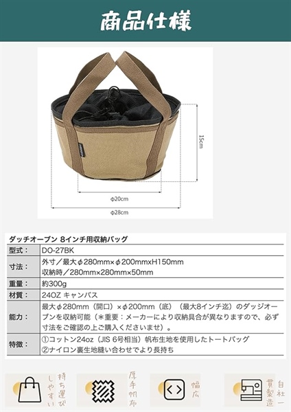 Túi đựng đồ cắm trại dã ngoại Campingmoon DO-25-BK / DO-27-BK được làm bằng vải Canvas dày chống mài mòn cao, dùng để cất giữ những chiếc nồi hoặc đồ dùng cắm trại, dã ngoại của bạn.